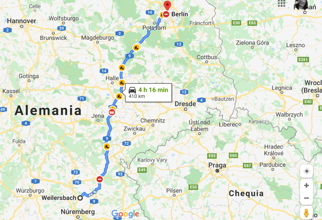 Les digo que voy a Berlín (aunque ya se veía en el cartel xD Tengo que practicar más esta parte del trato) y me dicen que ellos van a Leipzig. ¡¡Eso es más de la mitad del viaje!! Les presento, elles son Yoshua y Viviana, una pareja que vive en Sttutgart. Él nicaragüense de origen. Ella napolitana. Se dirigen a un retiro espiritual cristiano cuando me recogen. Me da la risa por dentro porque mi madre me decía de camino a la estación de servicio «Ahora te van a coger todes les religioses por el camino y te van a contar sus cosas en el coche mientras viajáis». Tal cual. Yoshua me comparte muchas opiniones y sensaciones con pasión y fervor, fe que lo llaman. Yo no comulgo con ninguna religión así que me intereso más en qué hace y cómo siente él a través de su fe. Compartimos puntos de vista profundos sobre qué es la espiritualidad y como no dejarla solamente en agua de borrajas sino también construir en nuestros sentimientos y emociones, vamos ser consecuente. Cada uno con su forma de entender la vida y con ello compartimos sentires y emociones muy bonitos. Me dejan en una gasolinera cerca a la autopista al sur de Leipzig. No es el mejor sitio así que ando un poco para saltar a la rampa de una incorporación a la autopista. Es temprano. Todo va a ir bien. Al ser un poquito cuesta arriba con dos carriles la incorporación, aunque no vengan muchos coches invita a cogerme el lugar. Y que no paro de sonreír también 😀