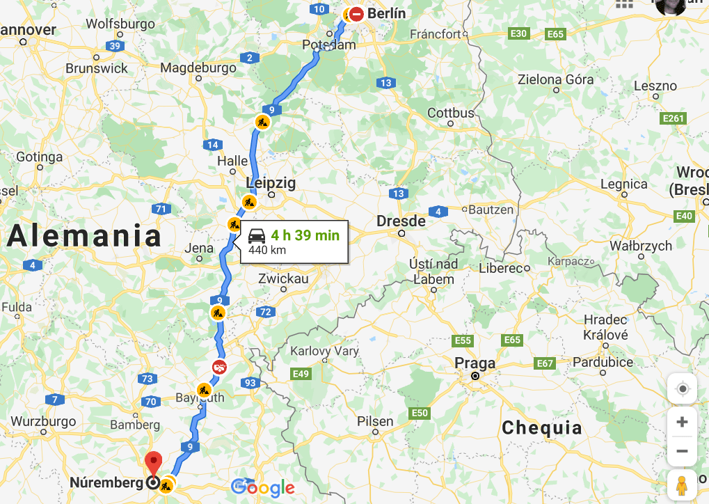 Al cabo de una hora me recoge un coche con una energía casi vehemente. Sus ocupantes tiene cara de pocos amigos y me invitan a subir de inmediato. Como si lo hicieran todo el rato o me conocieran. Me encanta. Entro al coche y tal cual sigue la escena. No se centran especialmente en mi. Les pregunto como se llaman y me dicen Polonia y otro Oleg. Los dejo como los hermanos Oleg en mi mente xD. No hablan ingles, solo alemán y yo no me apaño ni con el polaco ni aún con el alemán. No les da problema, a mí tampoco. Así desconecto un poco y dicen que me llevan a… Nuremberg!!! Hecho, hecho. Entre siesta y leer, Oleg conduce como una fiera. Fuman como carreteros en el coche. Me ofrecen, eso sí, y les debo parecer el caramelo en la puerta del cole cuando lo rechazo con una sonrisa de amigues de las mías y les ofrezco anacardos xD no pegamos ni con cola y a la vez que agustito todo. Nos plantamos en ná en Nuremberg. Cuando Oleg hace la pirula de meterse en direccion contraria por una incorporación de autopista porque se pasa la salida, ya me meo. Que bien lo hace y a la vez como se la ha jugado. Me dejan en una estación de metro con la misma seriedad y desapego, aunque me sonríe cuando le chapurreo en alemán que me gusta mucho como conduce.